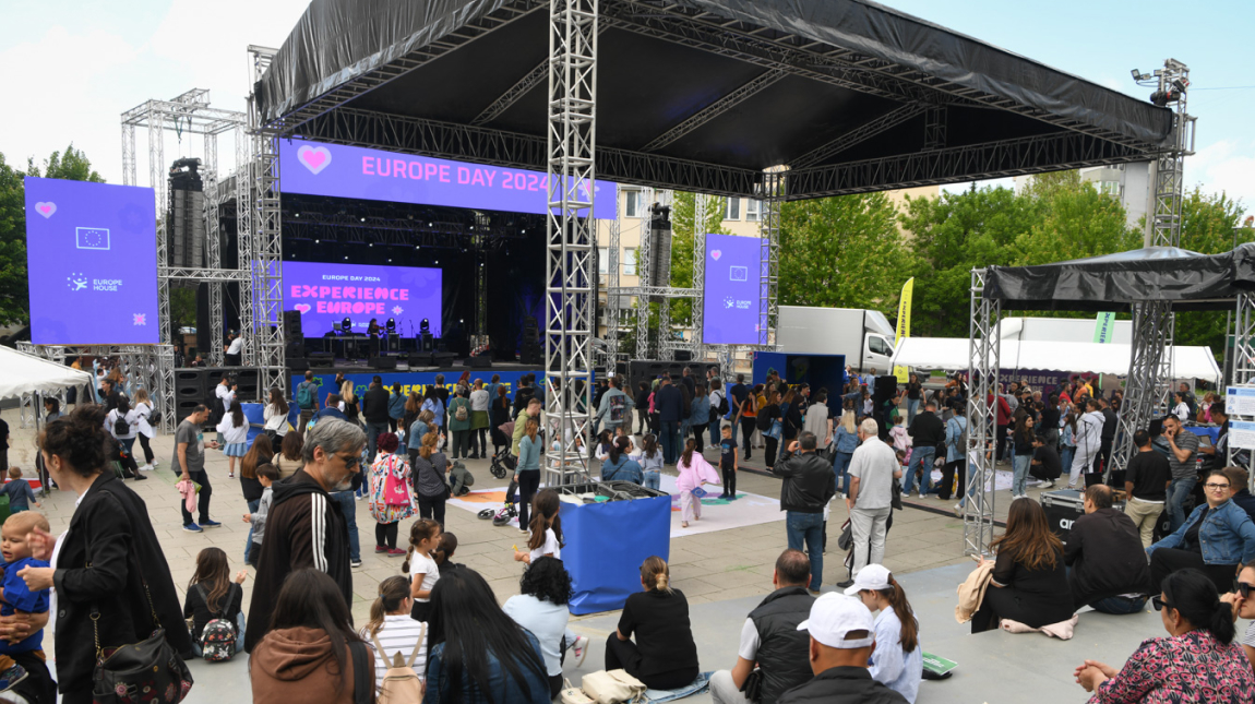 For Europe Day 2024, Koperativa teamed up with Europe House Kosovo and the European Union Office in Kosovo to deliver a nationwide campaign under the theme “Experience Europe.” Building on the emotional energy of the visa liberalisation milestone, the project brought EU values, culture, and identity closer to the people of Kosovo through a series of events that were as impactful as they were inclusive. Spanning three cities: Prishtina, North Mitrovica, and Prizren, the campaign unfolded over a packed schedule of 27 unique events, complemented by 27 city visits and an extensive school outreach programme. In the lead-up to Europe Day, Koperativa coordinated 15 school visits where EU and EULEX representatives engaged directly with students, sparking conversations about the European Union’s values such as inclusivity, education, sustainability, and digitalisation. The outreach activities strengthened the connection between Kosovo’s youth and the EU, encouraging curiosity, understanding, and participation.